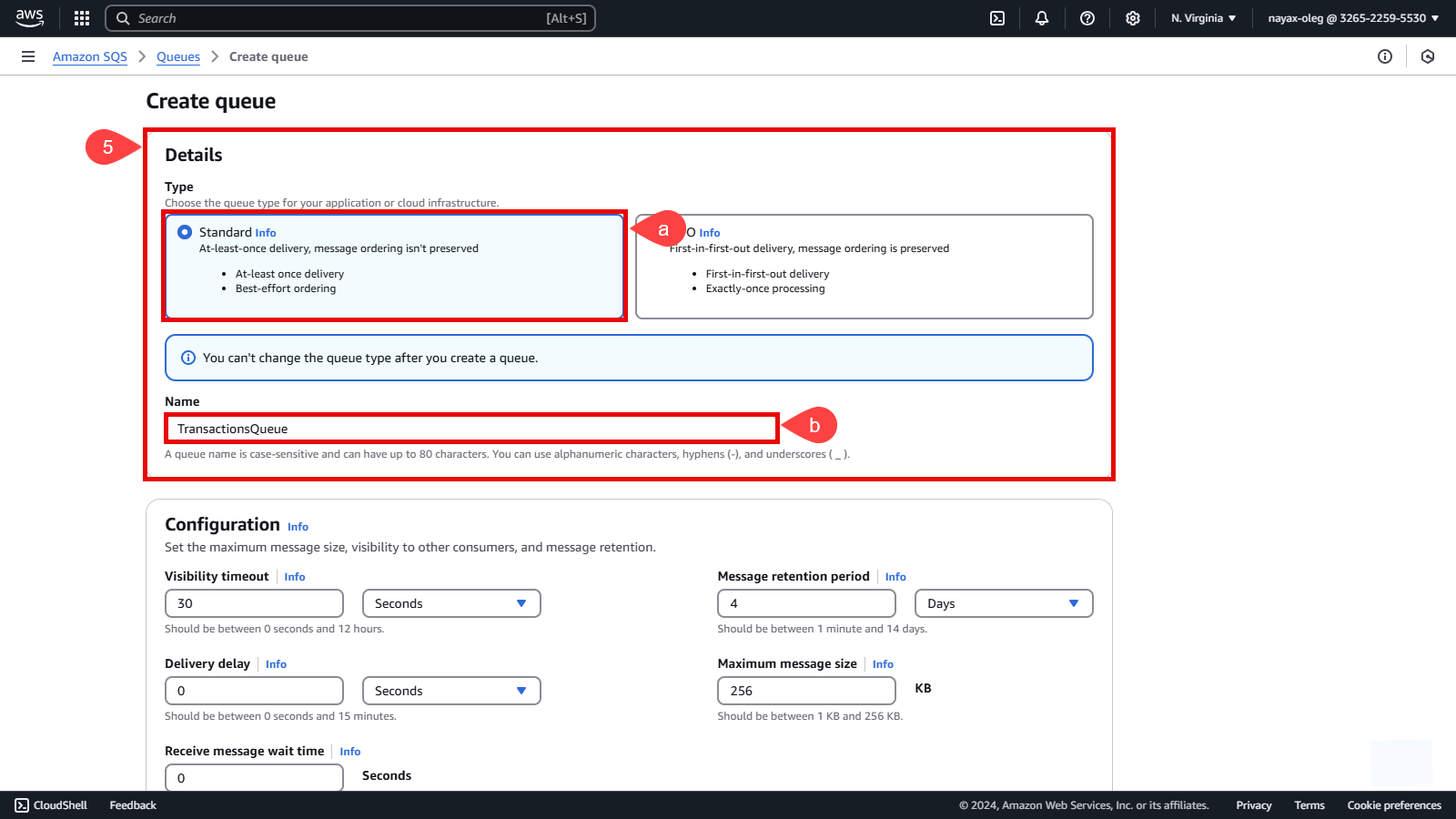 In the Details section: a. Select Standard as the queue type. b. Enter a unique name for your queue.