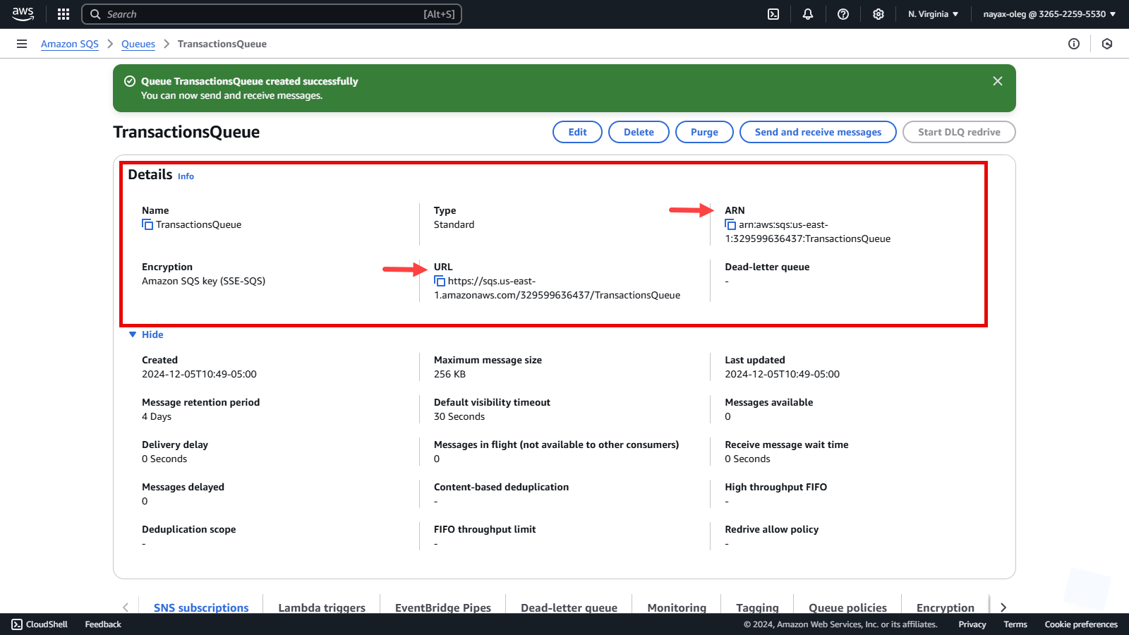 Once the queue is successfully created, a confirmation message will appear on the screen along with the Queue URL and ARN (Amazon Resource Name). Copy these values, which will be needed for integration and permissions setup in subsequent steps.