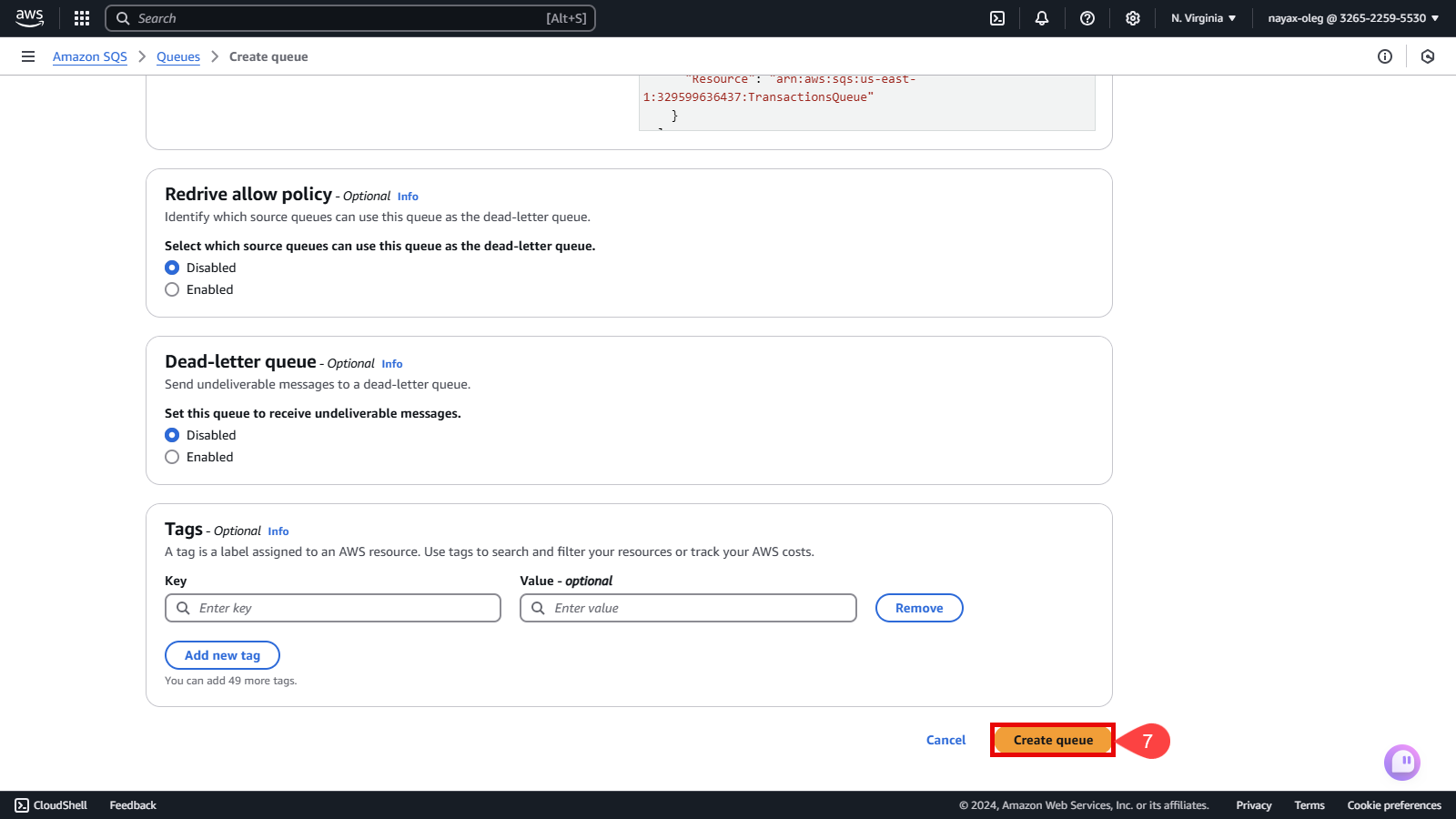 - Redrive allow policy (Optional): Enable or disable policies for message redriving.