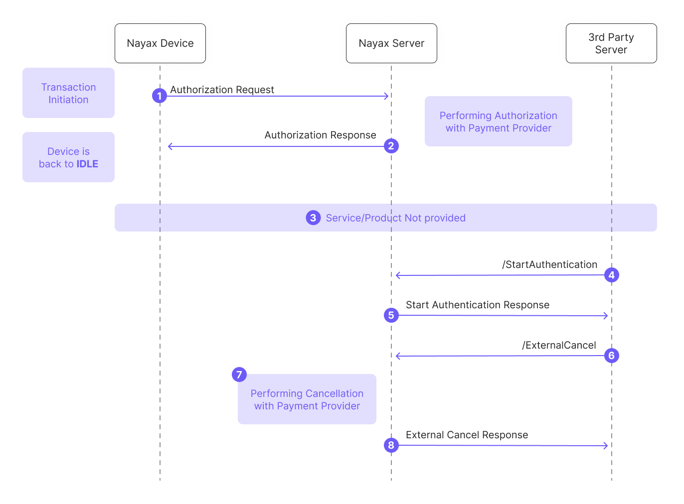 - External Cancel Response: The Nayax Server confirms the cancellation outcome to the Third-Party Server.