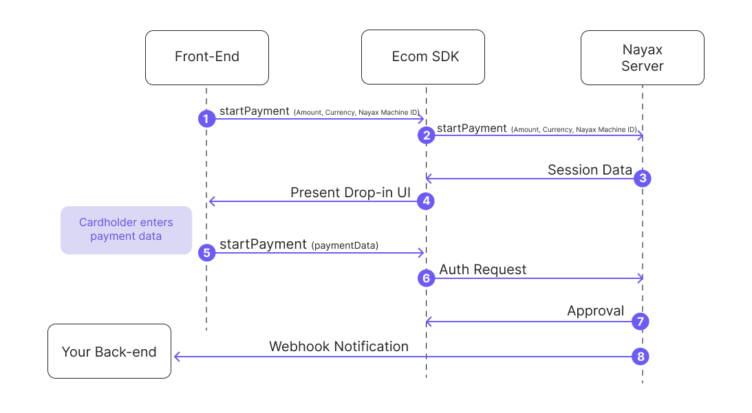 request from your front-end to the eCom SDK. - The eCom SDK sends this request to the Nayax Server.
