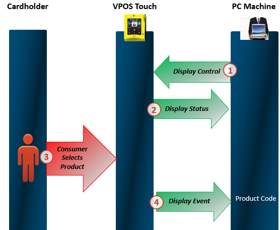 Once a consumer has selected a product (screen) on the device, the device would respond with information the peripheral regarding which screen was selected, to which it should respond with a "Vend Request" with the relevant product code and price in order for the transaction process to begin.