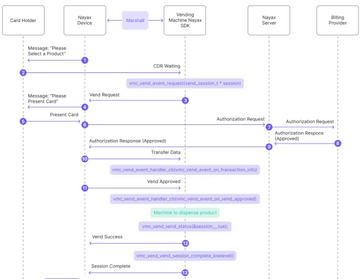 - The peripheral's SDK sends a vending request to the Nayax Device: