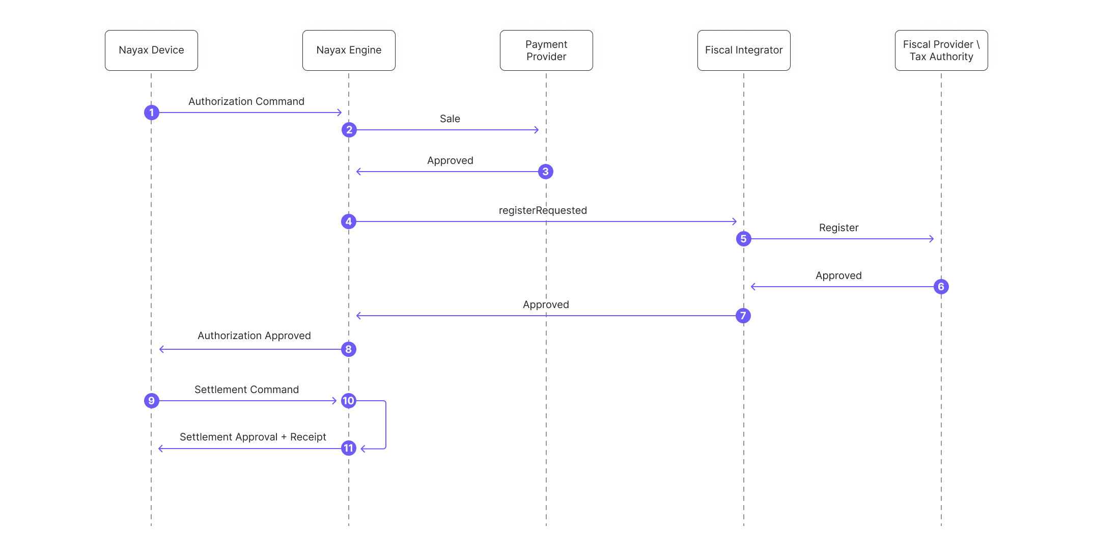 - Nayax Engine initiates fiscal registration by sending a request to the Fiscal Integrator.