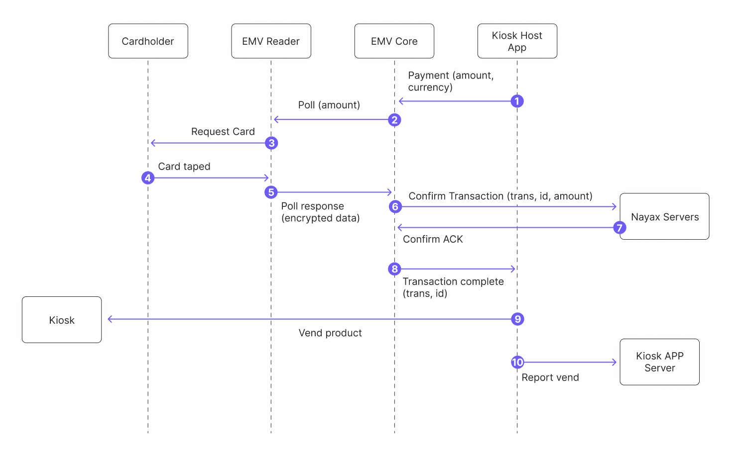 - EmV COre confirms the transaction and sends the details to the Nayax Server.