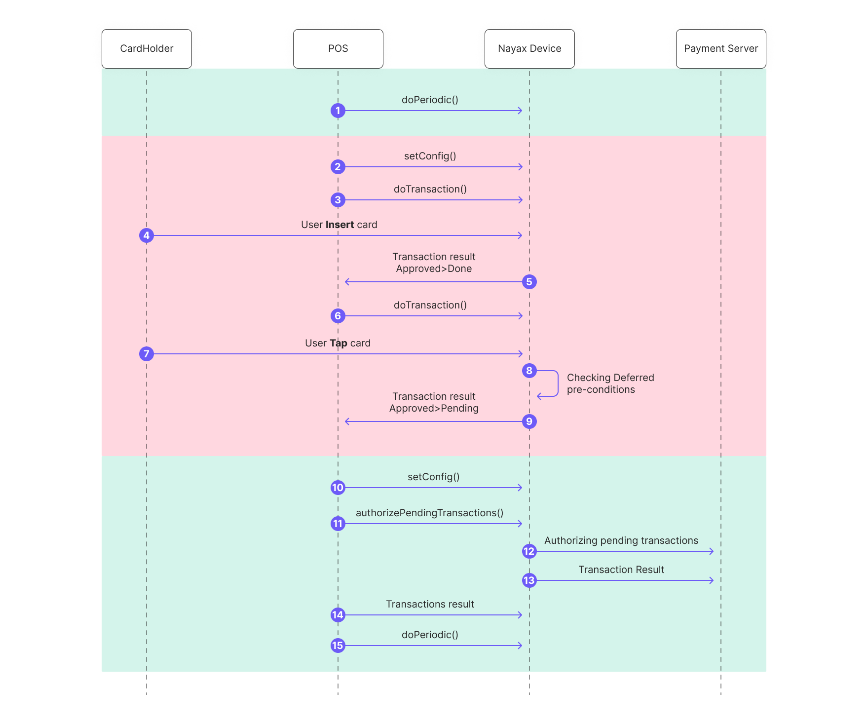 doPeriodic()to settle the stored card transactions. setConfig()Will switch the device to work in deferred mode, using offline mode.- The pos send a