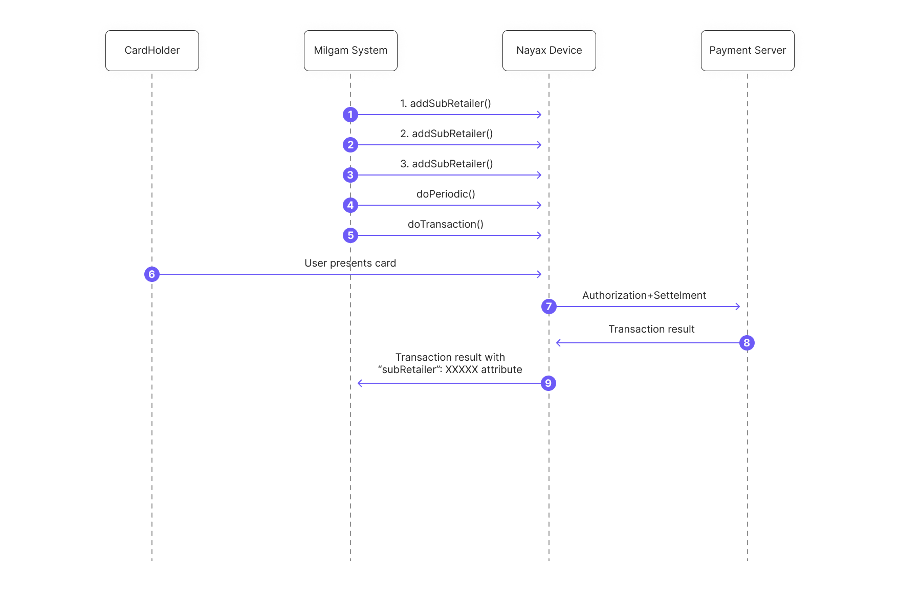 addSubRetailer()requests to the Nayax Device. In the example, three such requests are made. - The Milgam System performs its