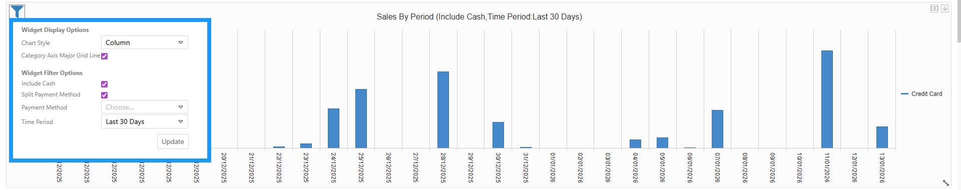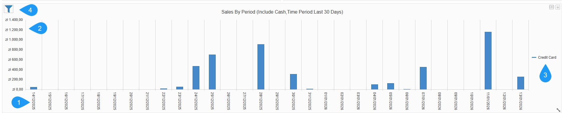 - Legend: Categorizes sales by payment method. In this view, it is tracking Credit Card transactions (indicated by the blue bars).