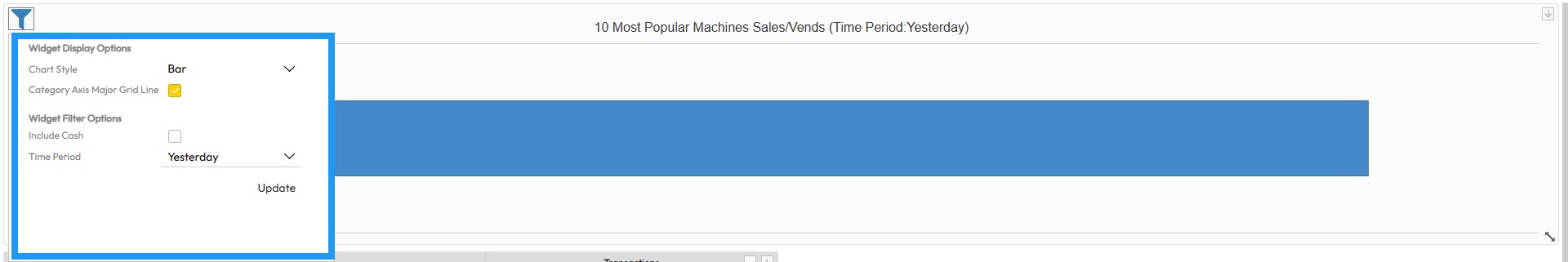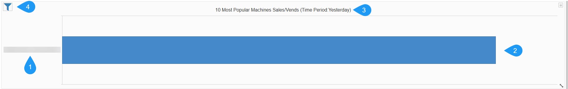 The 10 Most Popular Machines Sales/Vends widget provides a ranking of the top-performing machines in your fleet. This allows operators to quickly identify high-traffic locations and the most profitable units based on their sales volume.